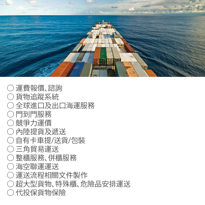 佳運國際海運承攬有限公司透過與世界五大洲的各國專業代理的密切合作,提供您完整、穩定的全球服務網絡,以及全世界各主要港口與城市之間的運輸連結提供戶對戶 (door-to-door ) DDU/DDP 的服務,並且提供客戶各種模式的海運運輸服務,隨時掌握最優勢的運費結構,致力於提升每位客戶的成本效益,務求提供客戶最經濟實惠、最佳運送時程的運費方案,協助客戶拓展貿易、發展商機,將貨物透過各種運輸完好交付到收貨人手中。